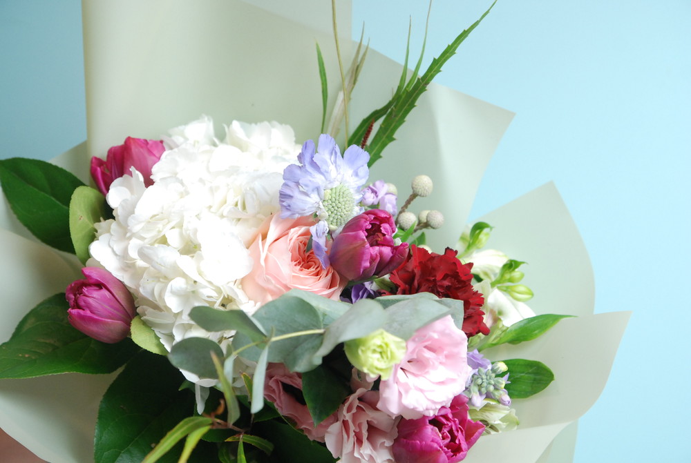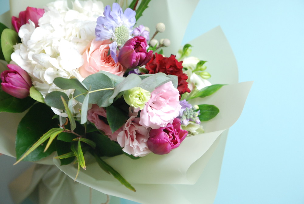 튤립, 화이트수국, 스카비오사