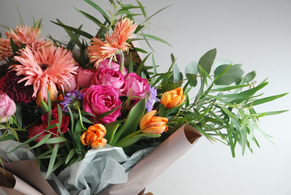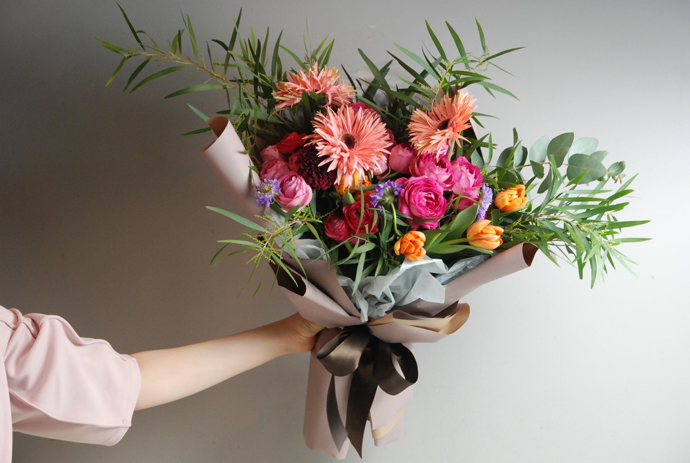 거베라 , 튤립, 장미, 라넌 모두 사랑스러운 꽃으로 만들어진 꽃다발