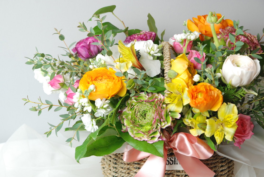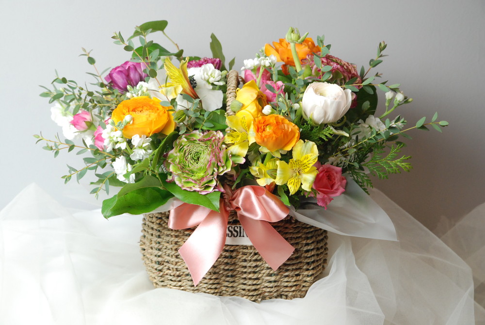 옐로우빛의 라넌이 포인트로 들어가 귀여운 플라워바스켓