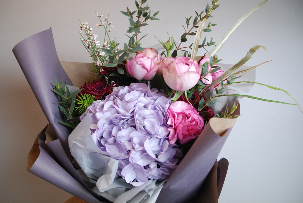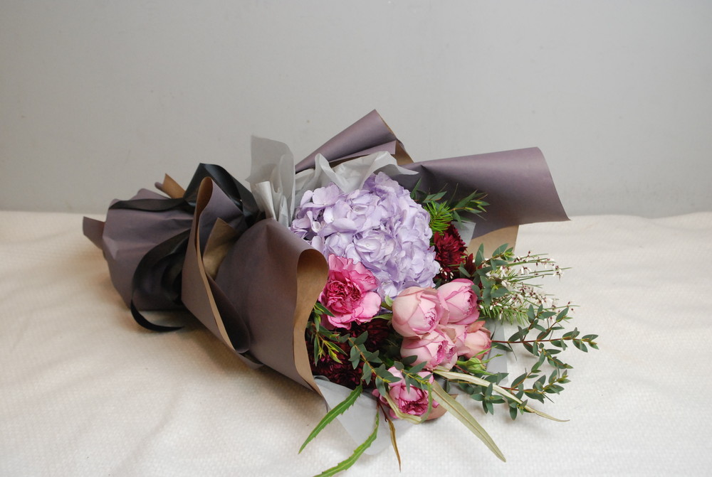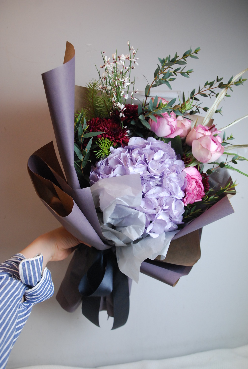 핑크로즈와 와인국화, 퍼플 수국이 어우러진 예쁜핸드타이드:)