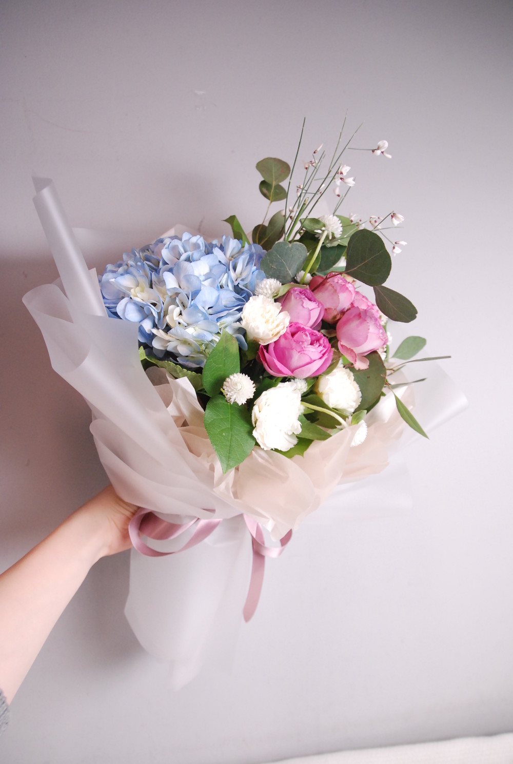블루수국과 핑크로즈 여리여리 천일홍이 믹싱된 핸드타이드:)