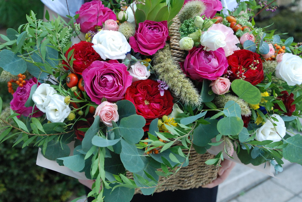유칼립투스와 함께 믹싱한 플라워바스켓